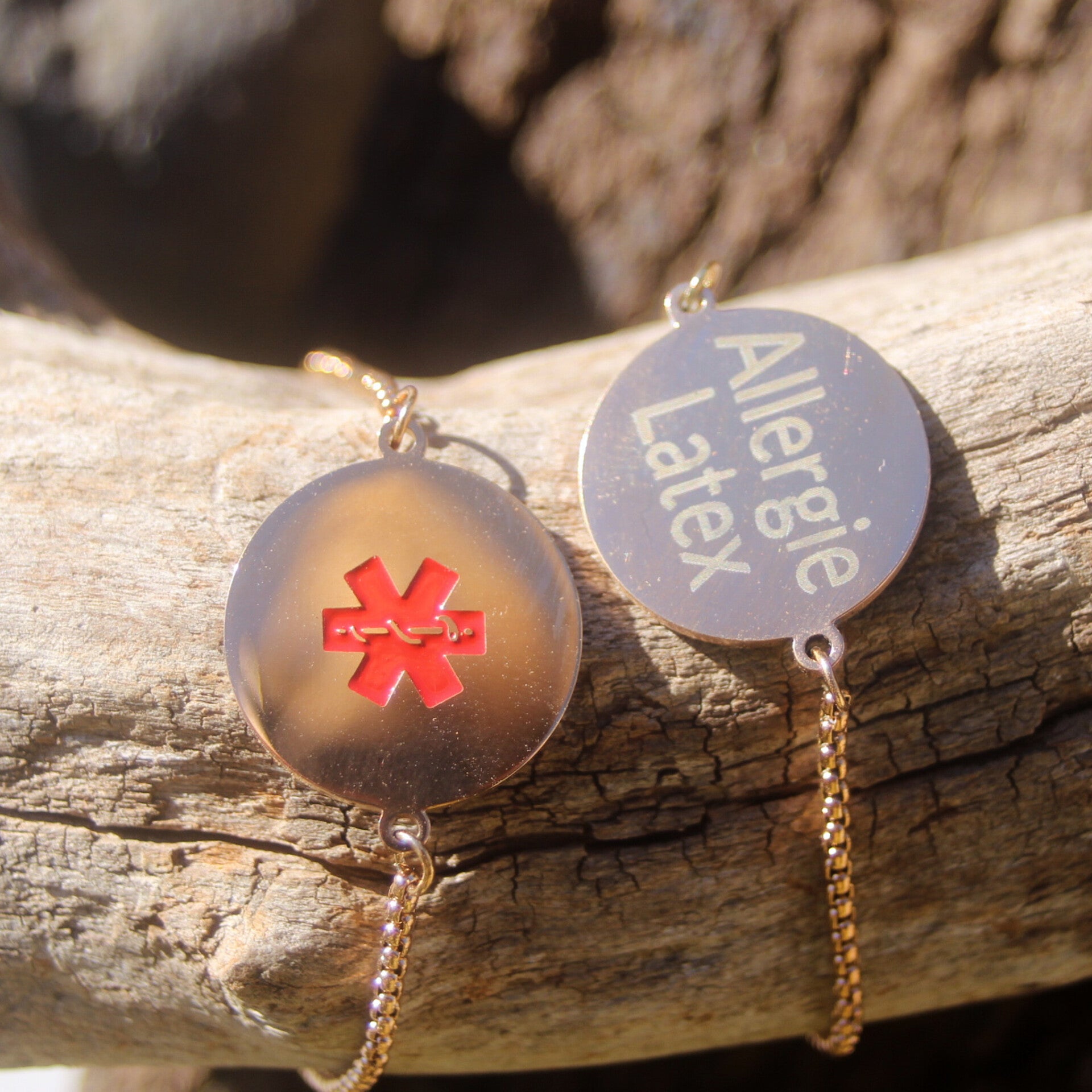 Bracelet médical réglable avec chainette et plaque ovale en inox, gravée au laser pour rester lisible dans le temps. Idéal pour indiquer vos informations vitales en cas d’urgence : prénom, pathologie, allergies, numéro d’un proche. Disponible en plusieurs couleurs pour s’adapter à votre style. Gravure personnalisée incluse
